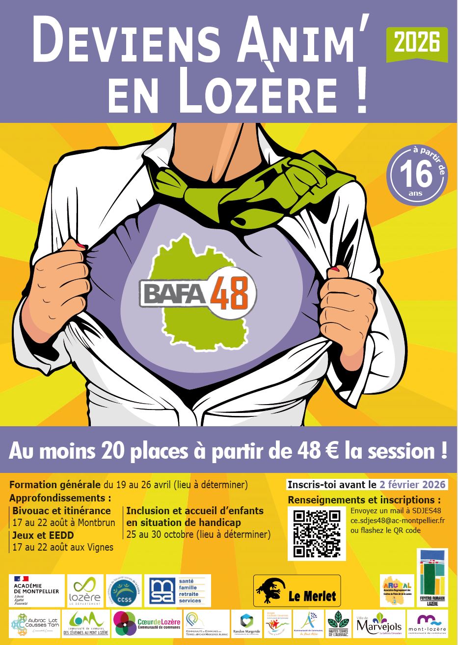 En 2026, pour la sixième année consécutive, la DSDEN, et plus particulièrement le service départemental à la jeunesse, à l’engagement et aux sports, met en œuvre ce projet BAFA 48 avec le soutien de partenaires financiers dont la Caisse Commune de Sécurité Sociale (CCSS), le Département de la Lozère et la Mutualité Sociale Agricole (MSA). Neuf Communautés de communes, ainsi qu’une commune, se sont associées en s’engageant à financer au moins une session de formation générale pour les familles résidant sur leur territoire.